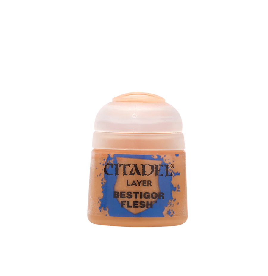 Citadel Layer er akrylmaling der bruges til at male ydre lag ovenpå en basecoat for at give definition og fremhæve detaljer. Denne bøtte indeholder 12ml Bestigor Flesh.