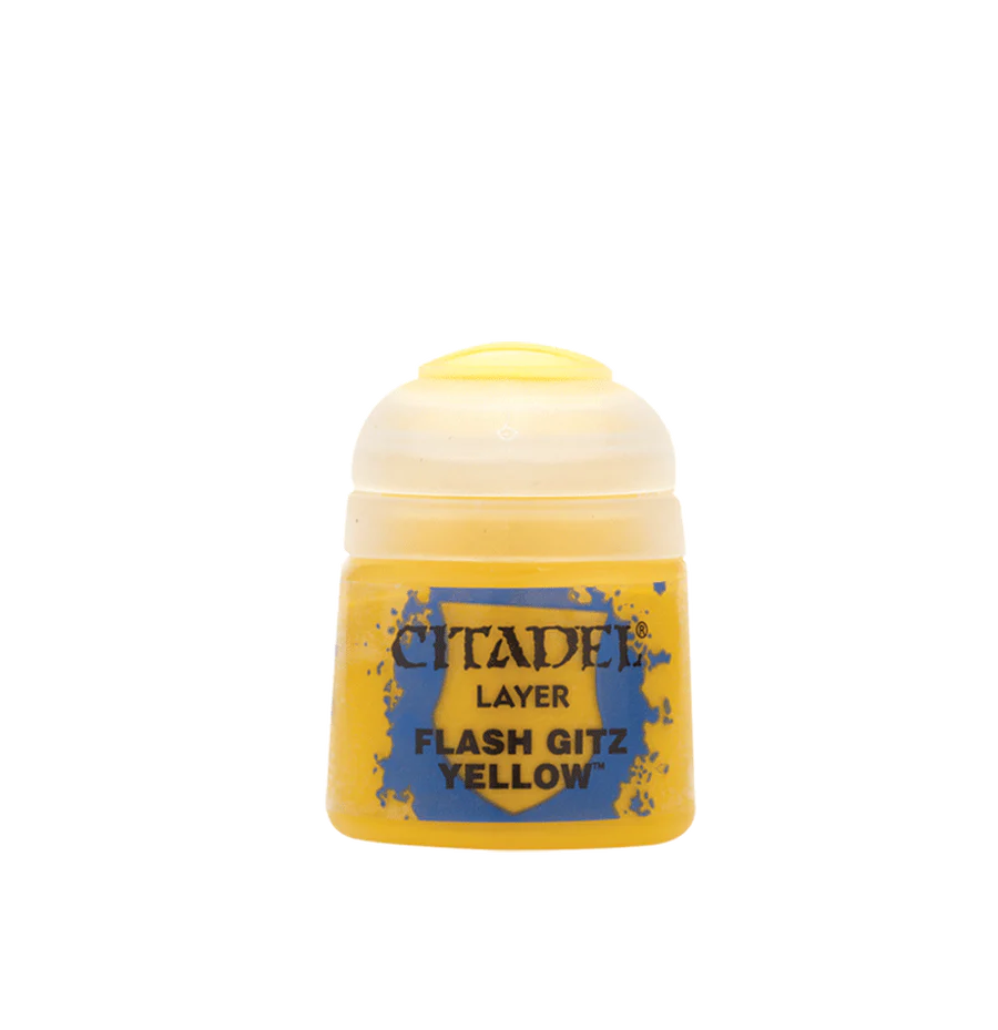 Citadel Layer er akrylmaling der bruges til at male ydre lag ovenpå en basecoat for at give definition og fremhæve detaljer. Denne bøtte indeholder 12ml Flash Gitz Yellow.