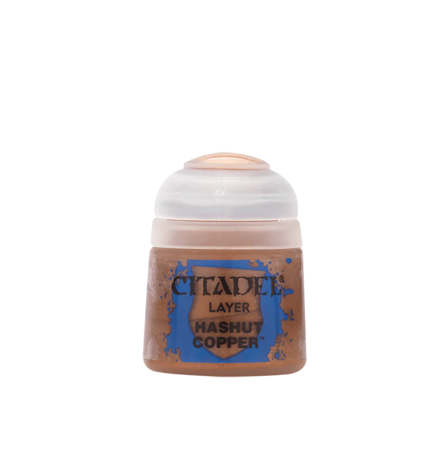 Citadel Layer er akrylmaling der bruges til at male ydre lag ovenpå en basecoat for at give definition og fremhæve detaljer. Denne bøtte indeholder 12ml Hashut Copper.