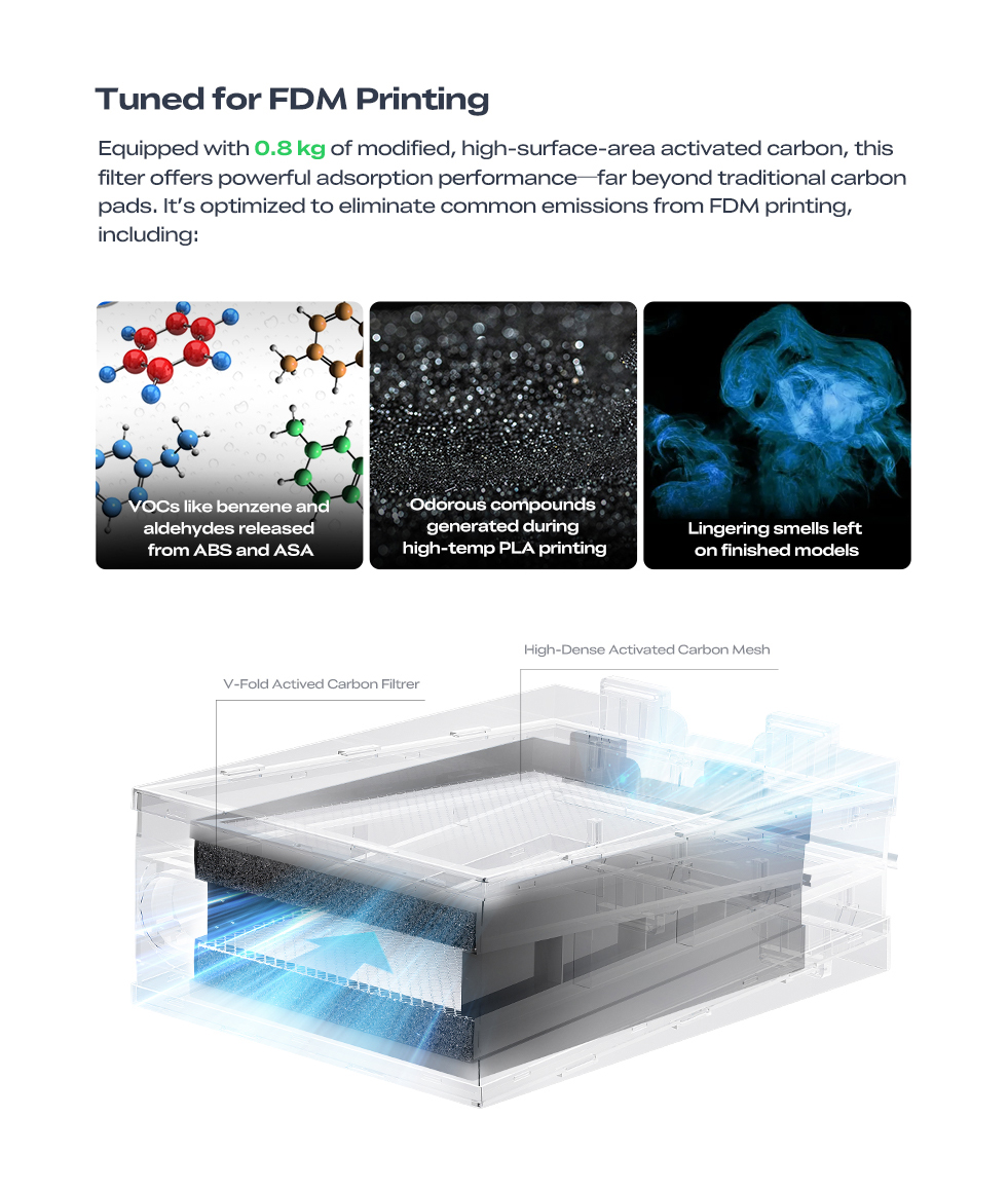 Skab et renere og mere behageligt arbejdsmiljø, når du printer med resin, ved at bruge Creality 3D’s Activated Carbon Filter – Resin Version. Dette originale filter er udviklet til effektivt at absorbere VOC’er (flygtige organiske forbindelser) og reducere den karakteristiske lugt, der kan opstå under resinprint.