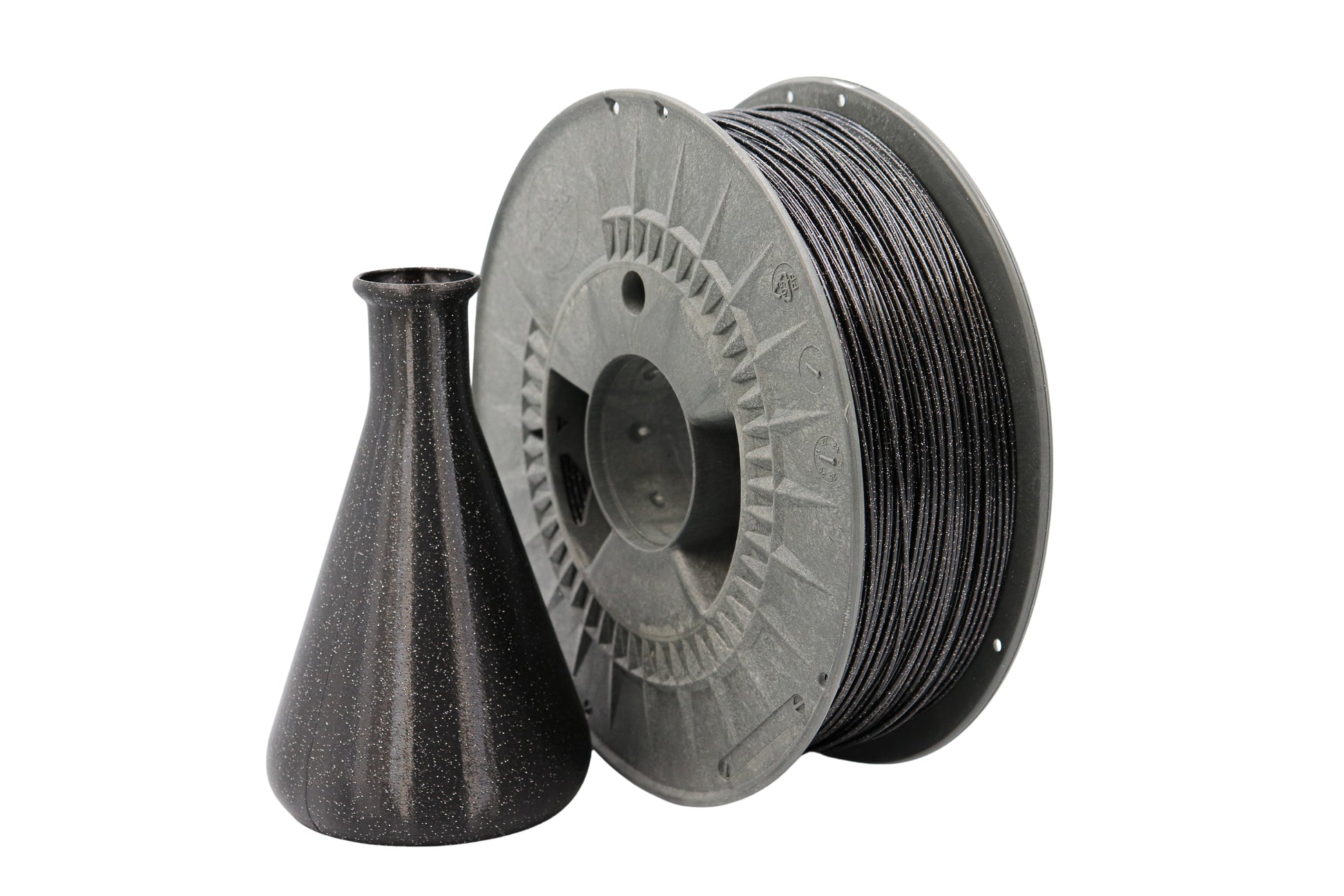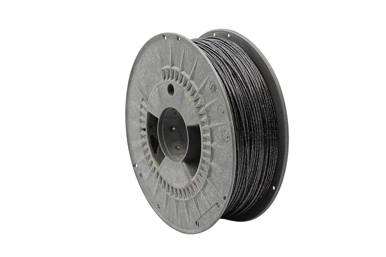 Oplev enestående kvalitet og bæredygtighed med FilaLab PETG Galaxy Black filament, præsenteret på en spole fremstillet af genbrugsplast og indeholdende 1 kg af filament.