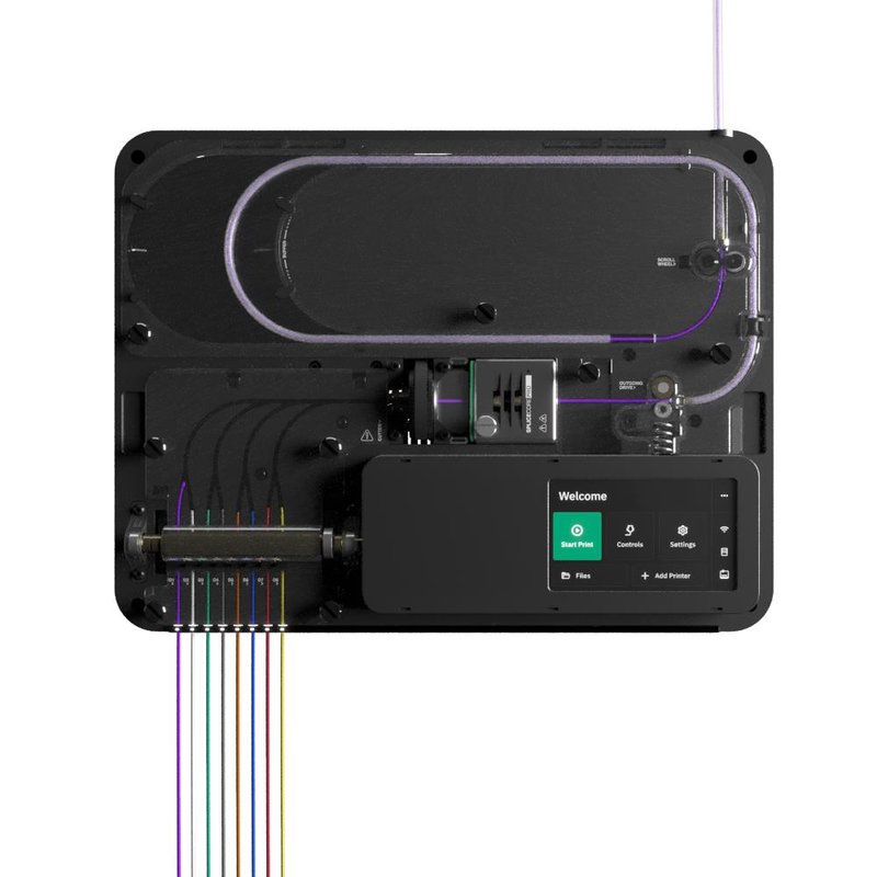Palette 3 PRO tager 8 typer filament og kombinerer dem i en enkelt filament tråd. Denne tråd føres derefter videre til din printer, hvilket gør det muligt for enkelt ekstruderprinter at lave multifilamentprint!