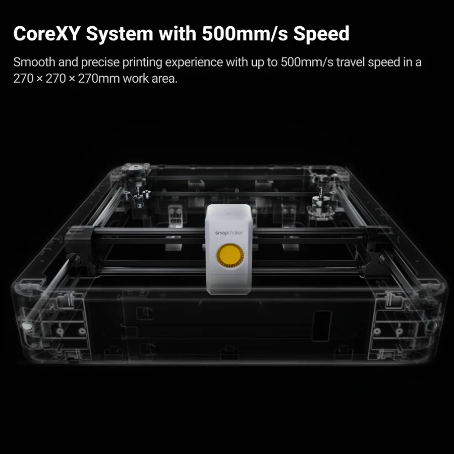 Printeren er bygget på et stift CoreXY-system med lette carbon fiber X-rails, som sikrer: