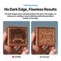 F2 Ultra UV virker på et bredt spektrum af materialer: glas og krystal (også til 3D indgravering), akryl, plastik, metal, keramik, træ, læder, silikone og meget mere. Den kan lave indgravering, overfladegravering, skæring og roterende gravering — med mulighed for både flade og runde objekter. -