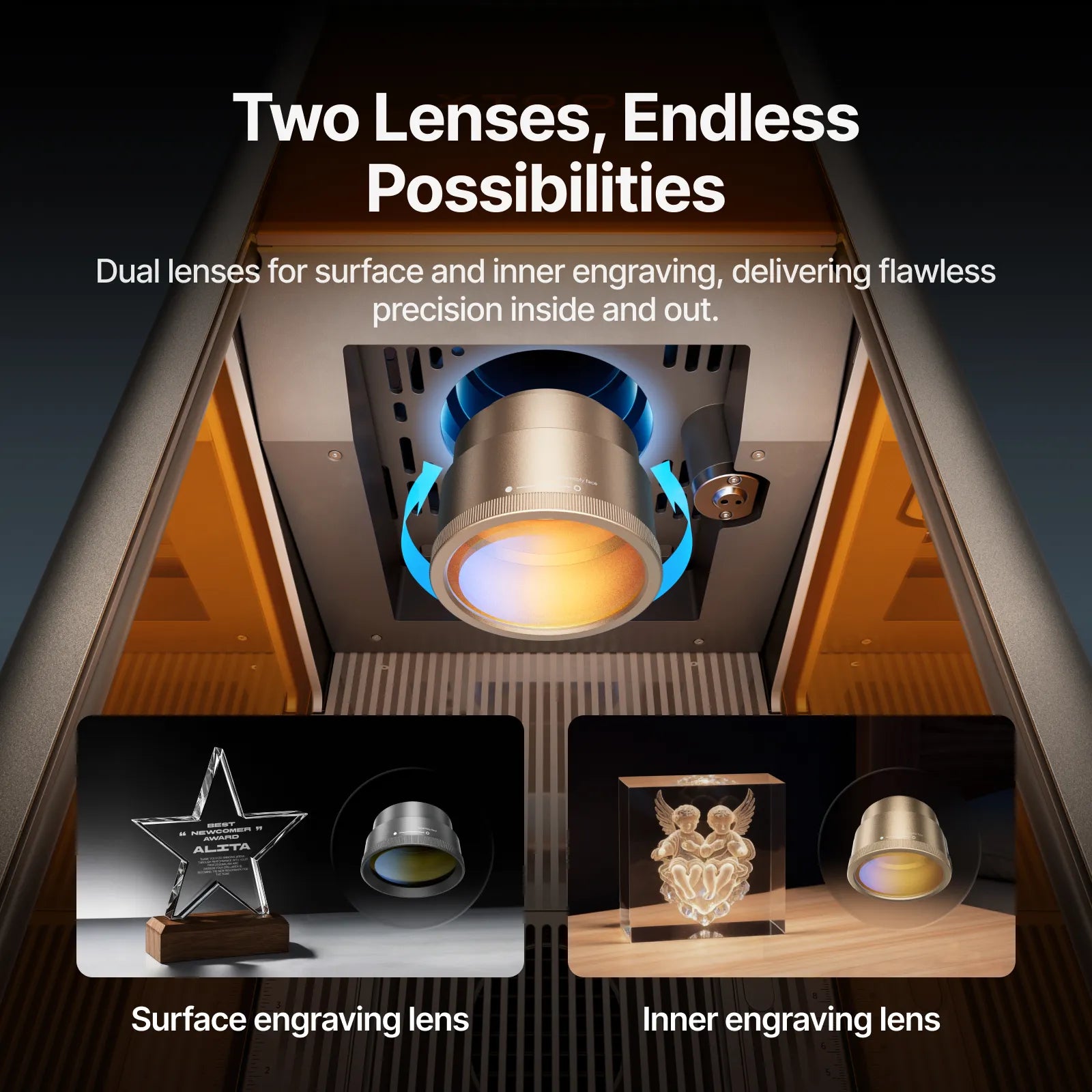 Udstyret med dual 48 MP kameraer + LiDAR til automatisk positionering og autofokus. Det giver ca. 0,2 mm nøjagtighed i placering og eliminerer behovet for manuel justering. Gravering sker med op til 15.000 mm/s, og arbejdsområdet er 200×200 mm — med mulighed for udvidelse til 200×500 mm via transportbånd. -