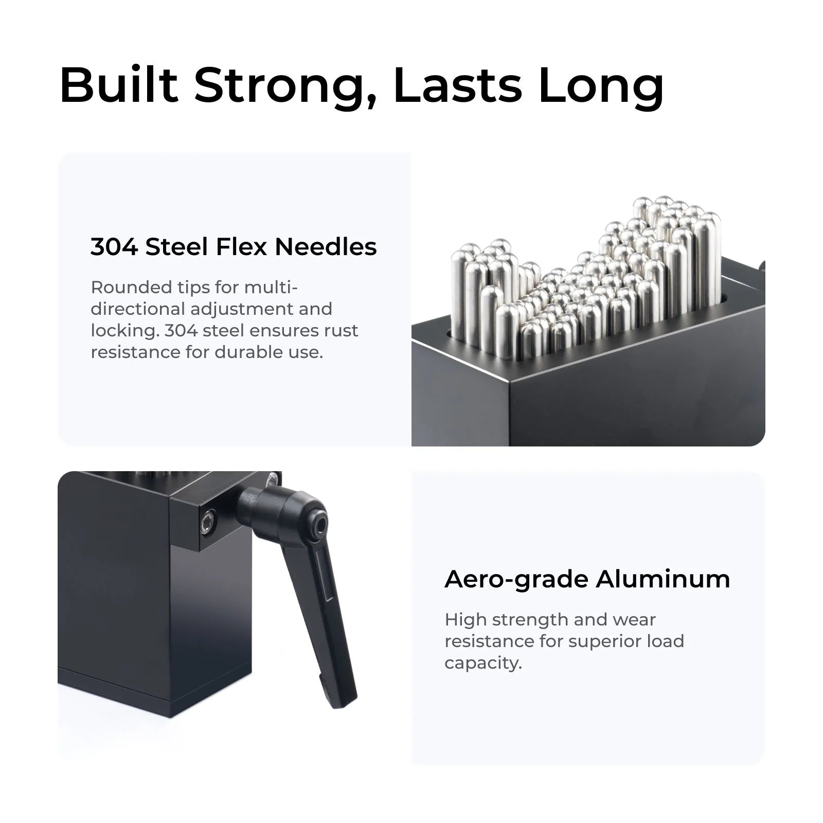 Med et justerbart pin bed i rustfrit stål (304 stainless steel) på 30 × 79 mm tilpasser fixturen sig nemt til objekter med ujævne eller skrå baser, så du altid får en sikker og præcis positionering – uanset form eller vinkel.