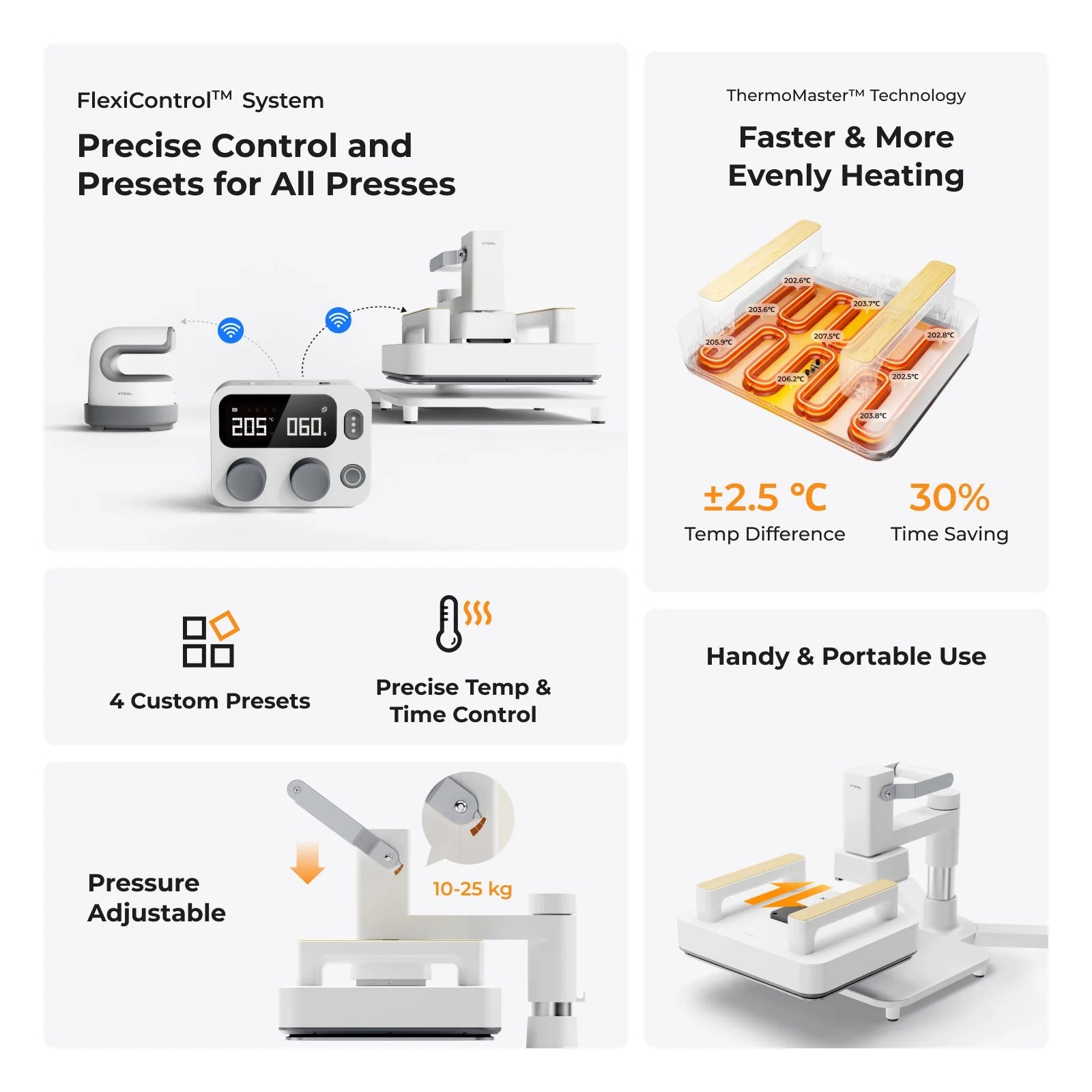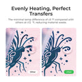 Takket være ThermoMaster™-teknologien varmer pressen op til 30 % hurtigere og fordeler varmen jævnt over hele pladen. Det giver perfekte overførsler i høj kvalitet – uden afskalning, krøl eller farvetab. Med præcis temperatur- og tidskontrol kan du gemme brugerdefinerede forudindstillinger og spare tid, uanset om du laver HTV, DTF eller sublimation.